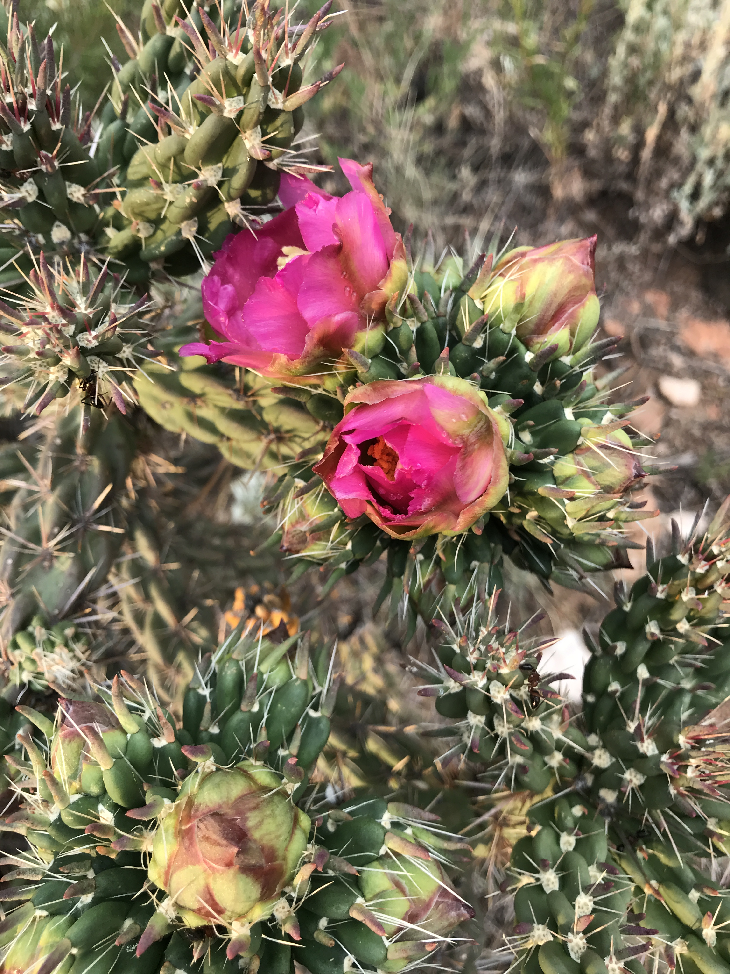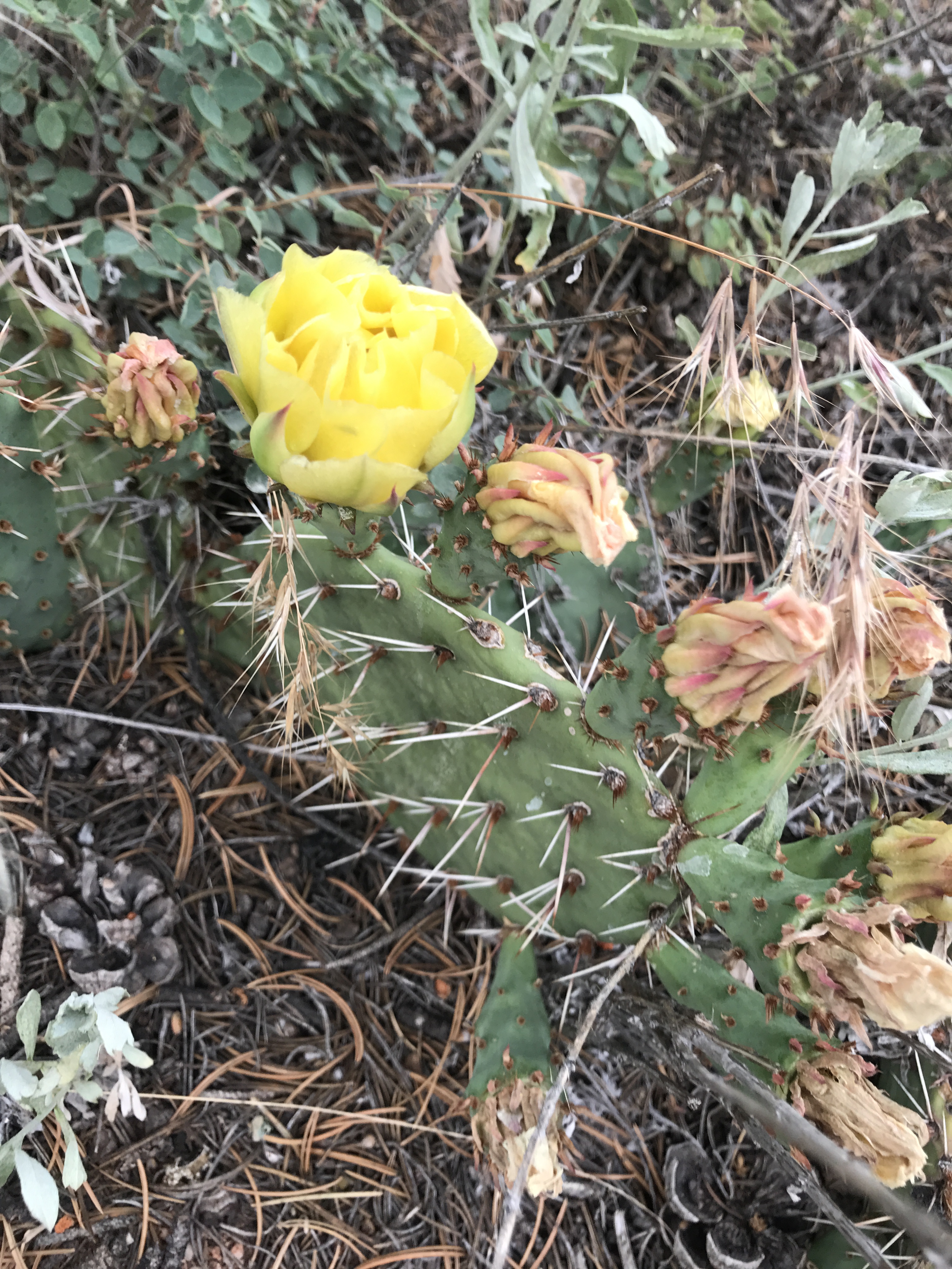I’m getting faster at the whole tent thing. It’s actually not stressful now and has a great payoff. It’s kind of like vacuuming or ironing – not that much fun in the process but you see the results of your efforts immediately! Our next door neighbors, a sweet young couple from Tennessee, were setting up also, and Lexi made quick friends. Once we got our site altogether (no dinner necessary – re: Chick-Fil-A in Pueblo), we headed out for a short hike. Lexi encountered the first cactus of her young life, so staying on the leash proved to be the best option. But how beautiful they were! I was surprised to find cactus up here, though of course it is very arid.