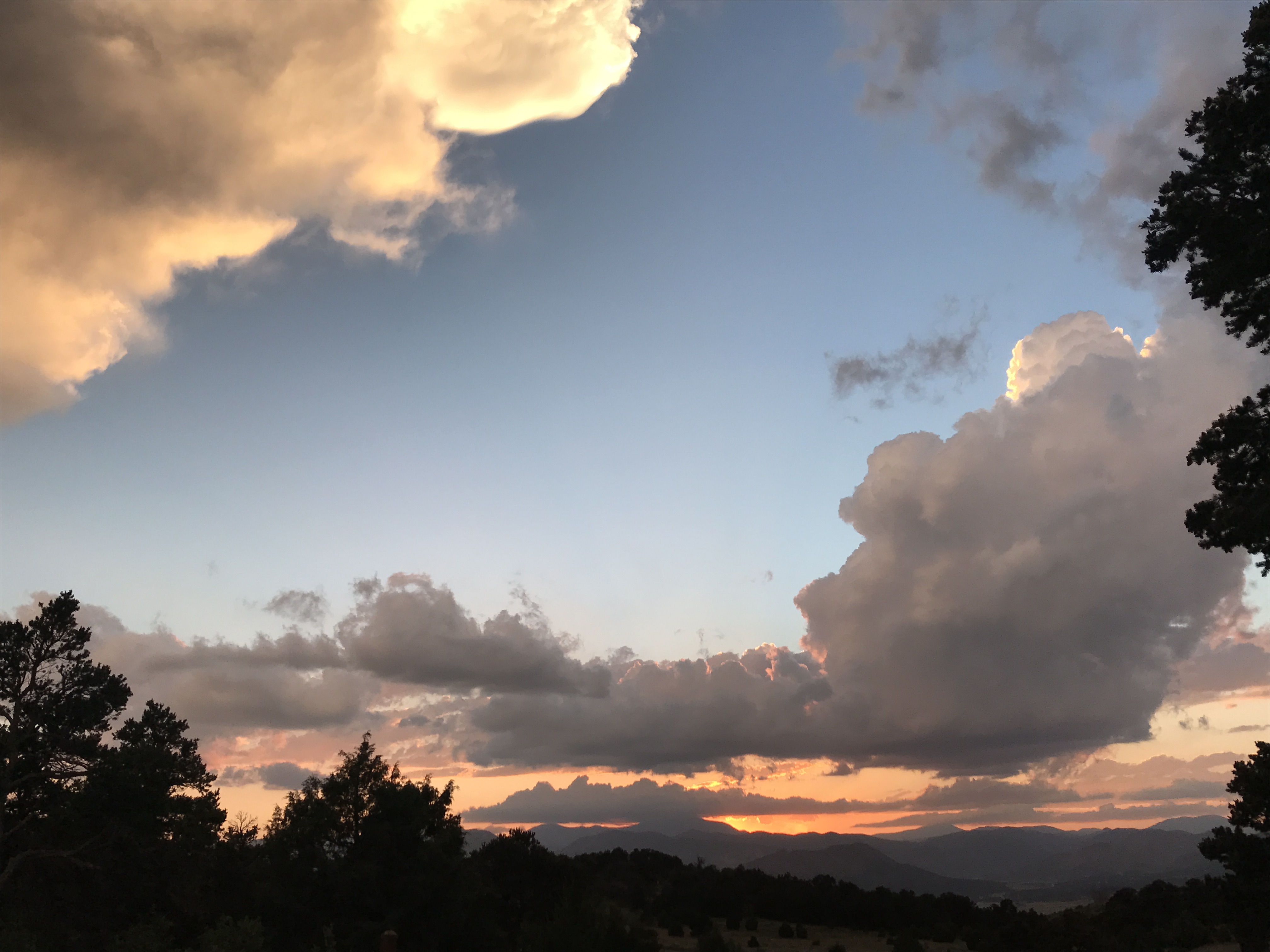 So here I sit, laptop and fire, dog at my feet, staring alternately at my writing and the clearing sky ahead. (And wine! I totally didn’t notice it in the photo until just now!) Behind us thunder rumbles down the valley. The miles-away lightning provides quite the show, billowing clouds lit from within, like kids playing flashlight tag in a giant tent. In fact, this will be a good place to stop so I can soak it all in. And just now, as
