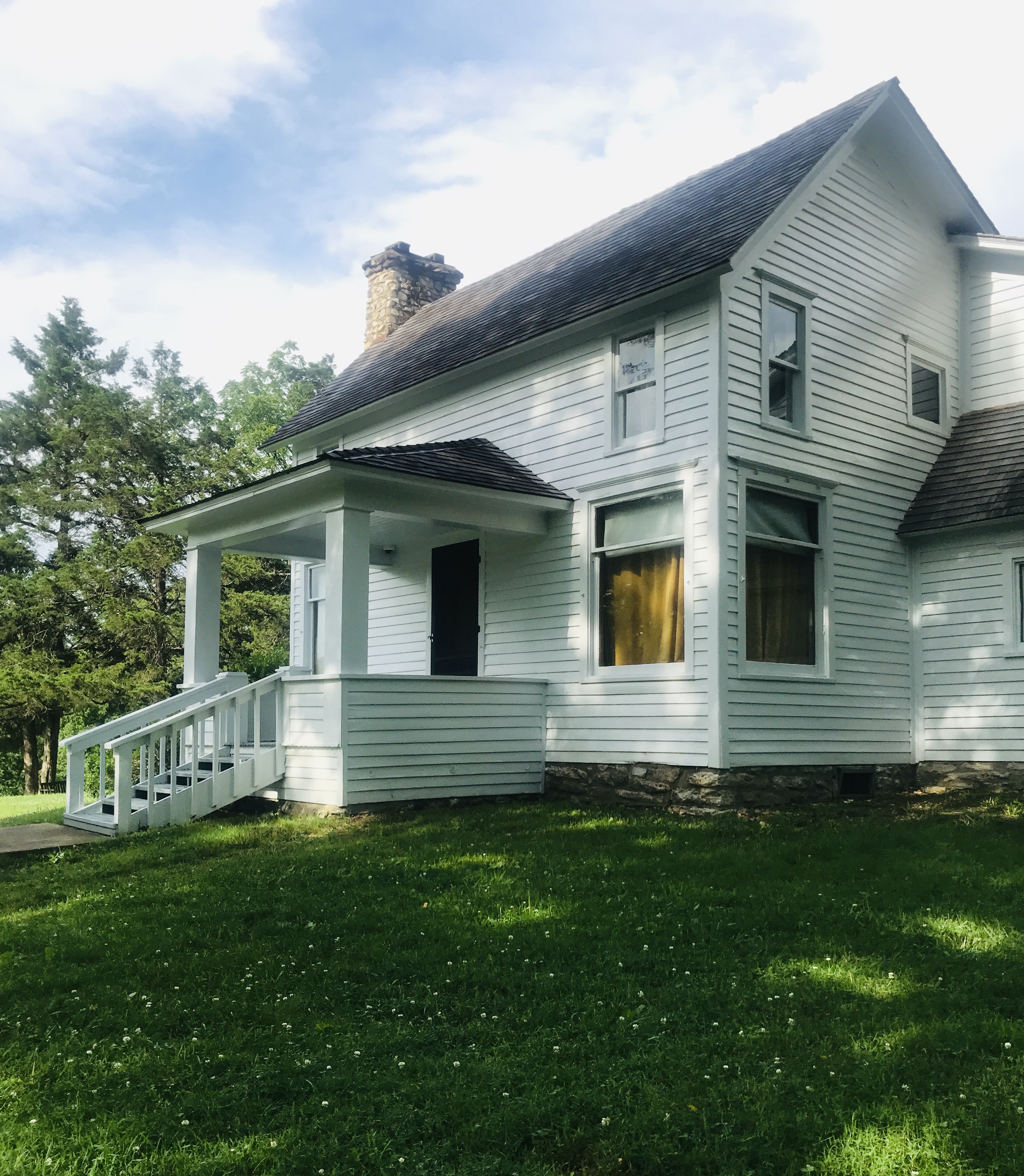 Rocky Ridge Farm, home of Laura, Almanzo, and daughter Rose. Turning in, it just felt like arriving at a friend’s house. Just a few miles out of the small town of Mansfield, the farmhouse sits perched on a rise above the road. It’s much larger than I would have expected, with its white-painted wood and beautiful stone chimney. It has the look of a well-loved place that has been added to over the years. The front steps and small porch actually face the side, with mature beautiful trees creating a small grove-like setting. The overall feeling is both welcoming and pleasant as golden cotton curtains hang in the front room.